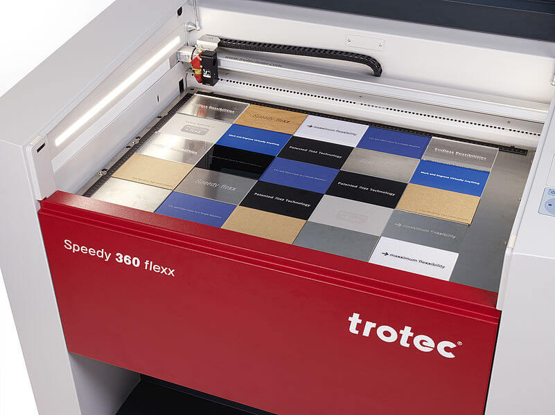 Trotec’s flexx technology maximizes output and reduces overhead, providing a rapid return on the investment. The system combines a CO2 laser for cutting and engraving a wide variety of materials (including plastic, wood, rubber and glass) with a fiber laser for marking plastics and metals, eliminating the need to use and maintain separate systems to process jobs that require both laser types. Using a single system is more efficient because it eliminates the need to stop and start jobs, and with one system and one beam source, maintenance costs and processing times are cut in half. Depending on the material, the two laser sources are activated alternately, allowing you to perform endless applications in one process step.